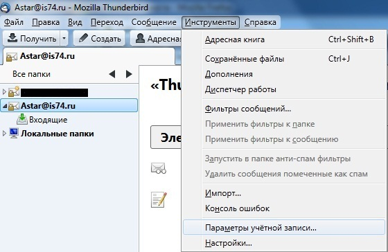 6. Ваша учетная запись в почтовом клиенте Mozilla Thunderbird создана. Теперь необходимо произвести дополнительную настройку параметров учетной записи. Для этого в верней части программы нажмите пункт «Инструменты» → «Параметры учетной записи».